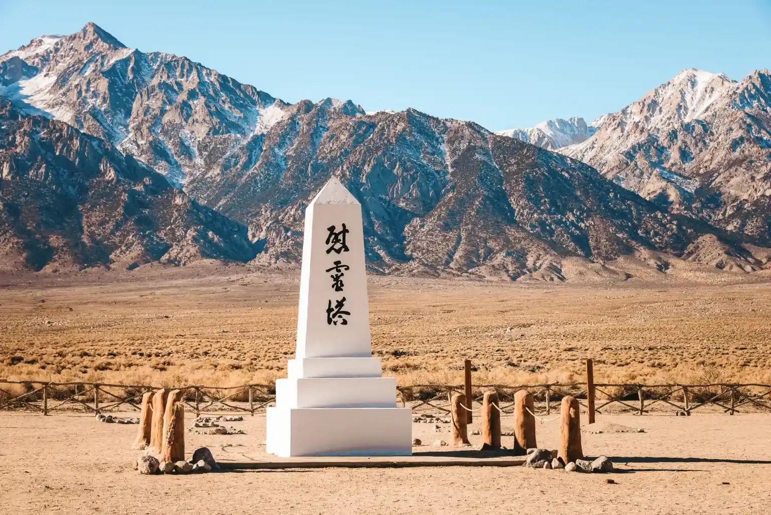 One of ten camps where Japanese American citizens were incarcerated during World War II, Manzanar is now a National Park Service site with a cemetery, watchtowers, barracks, and an interpretive center.